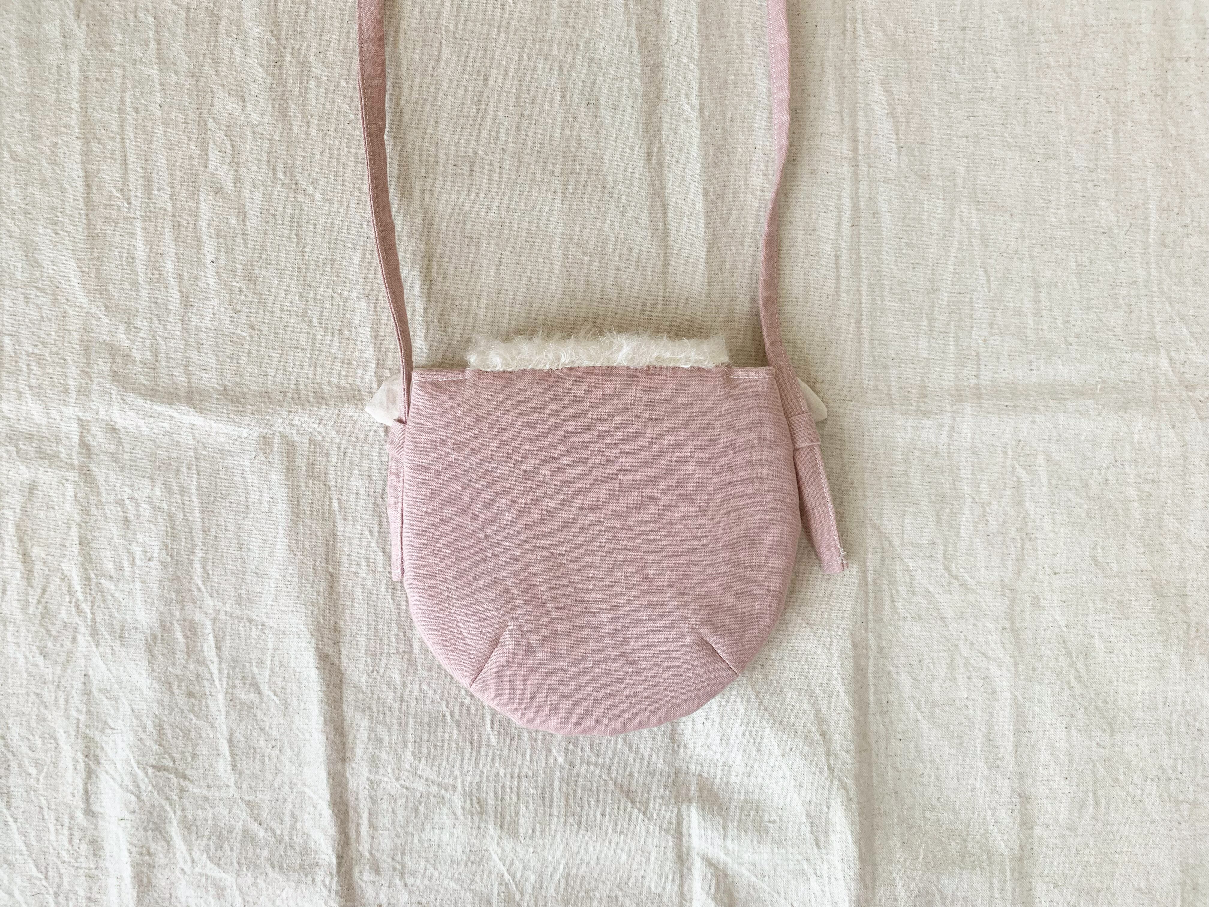 写真では見た感じぺたんこですが、下側両面にタックが入っているのと中綿を入れて製作しているのでぷっくり膨らみのある可愛いポシェットに仕上がっています。