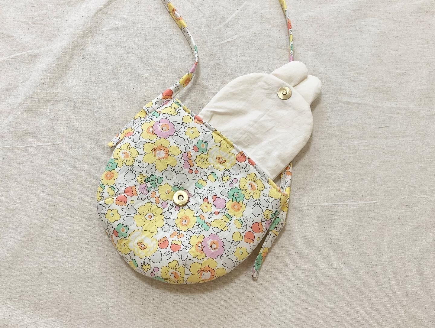 写真では見た感じぺたんこですが、下側両面にタックが入っているのと中綿を入れて製作しているのでぷっくり膨らみのある可愛いポシェットに仕上がっています。