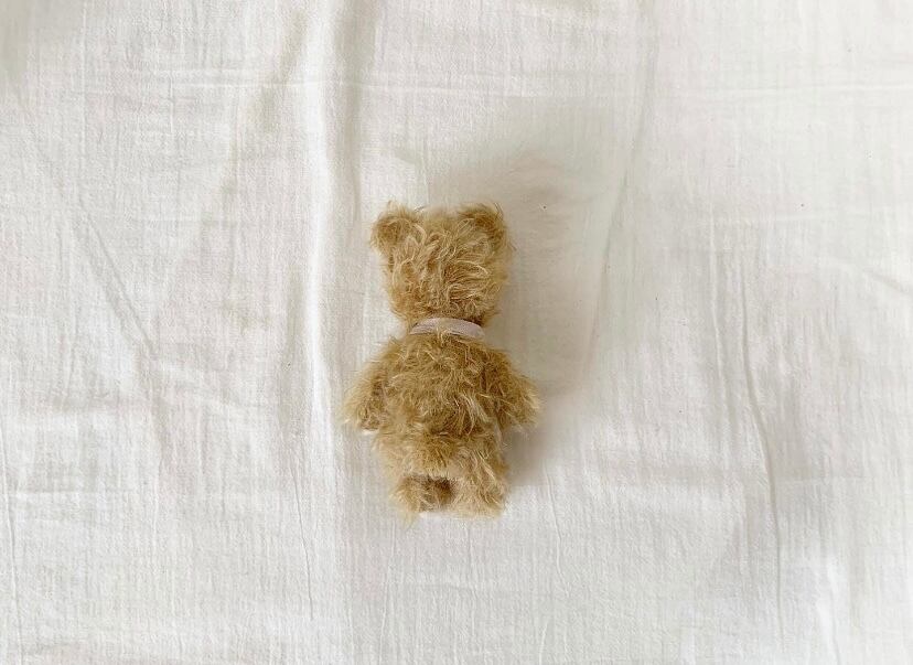 テディベアの形をした経年変化も楽しめる、カールヘアの小さなくまのぬいぐるみ。