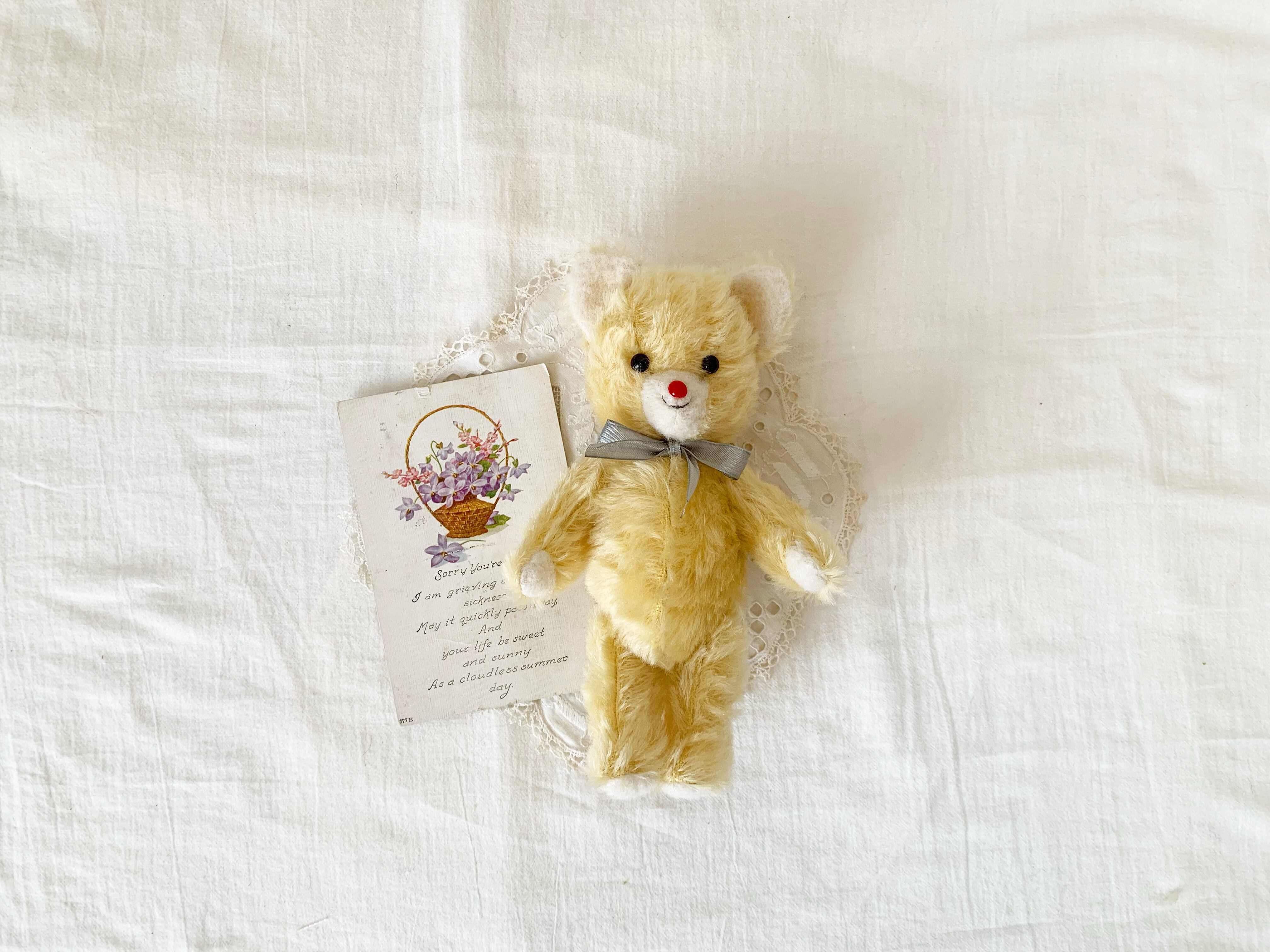 テディベアの形をした経年変化も楽しめる、くまのぬいぐるみ。