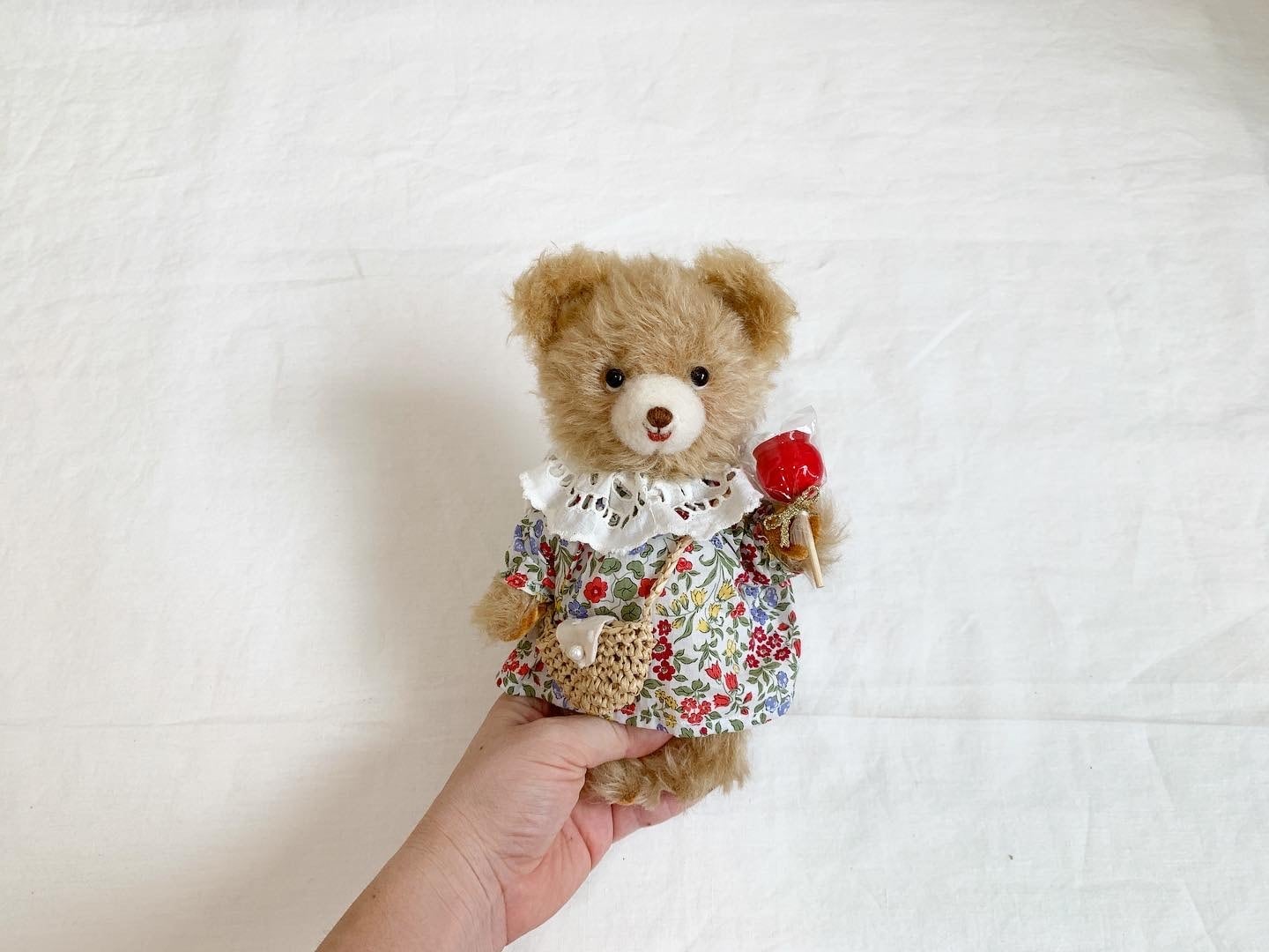 おめかしをして、大好きなツヤツヤの赤いりんごあめを持っているくまちゃんです。