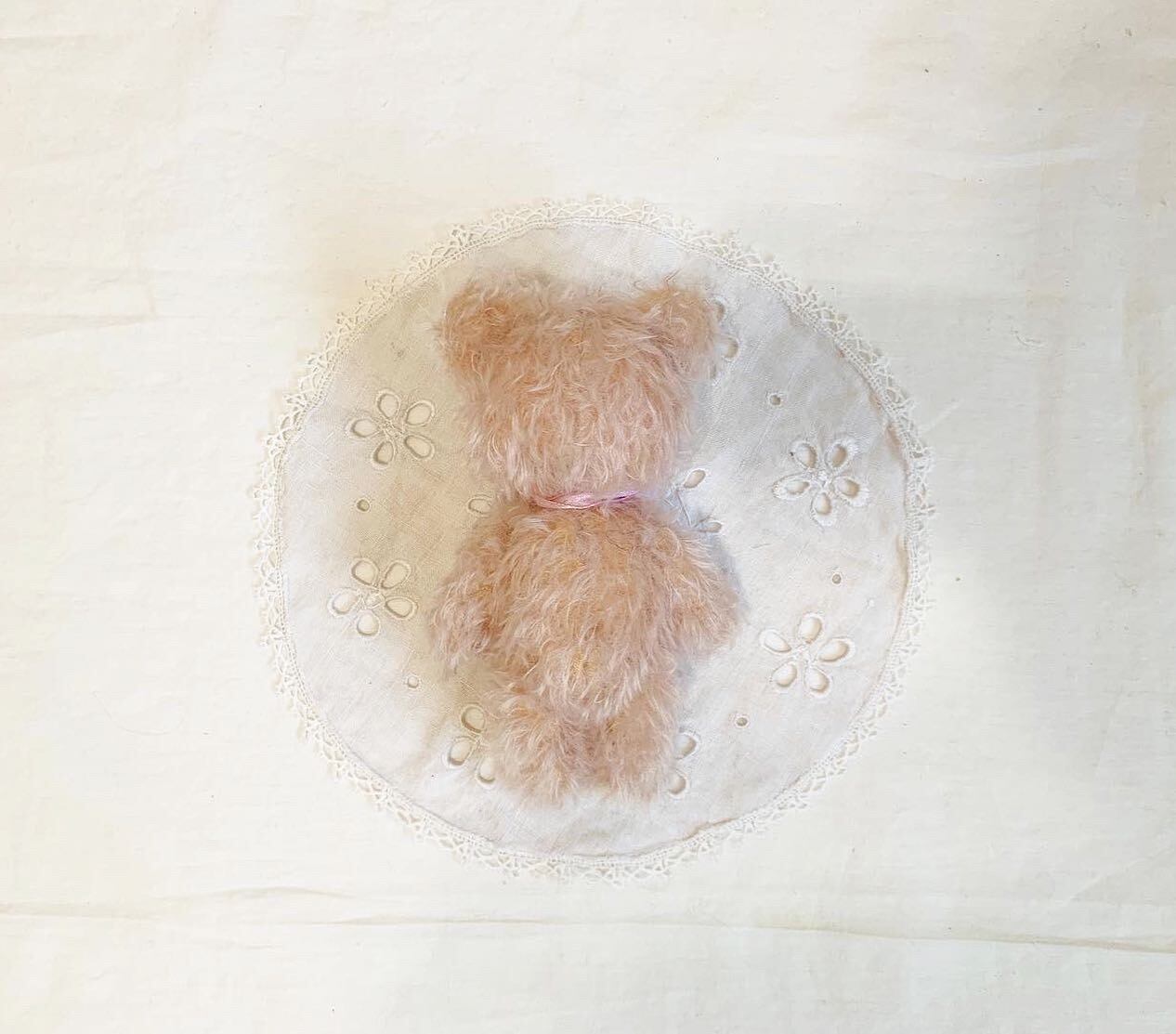 コロコロ転がって生きそうな赤ちゃんみたいなフォルムのくまちゃんにオリジナルで染色したピンクのリボンを付けておめかししました!