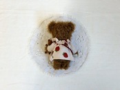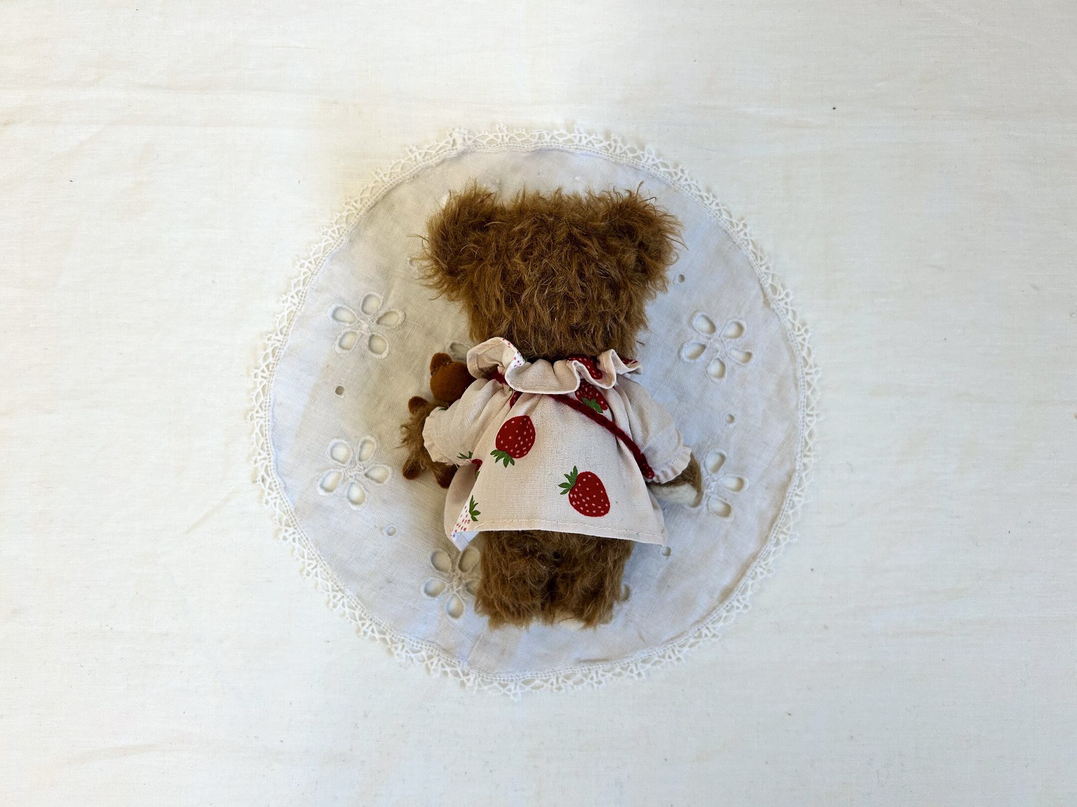 いちごのポシェットと小さなくまのぬいぐるみを持ったmarucoroベアです。