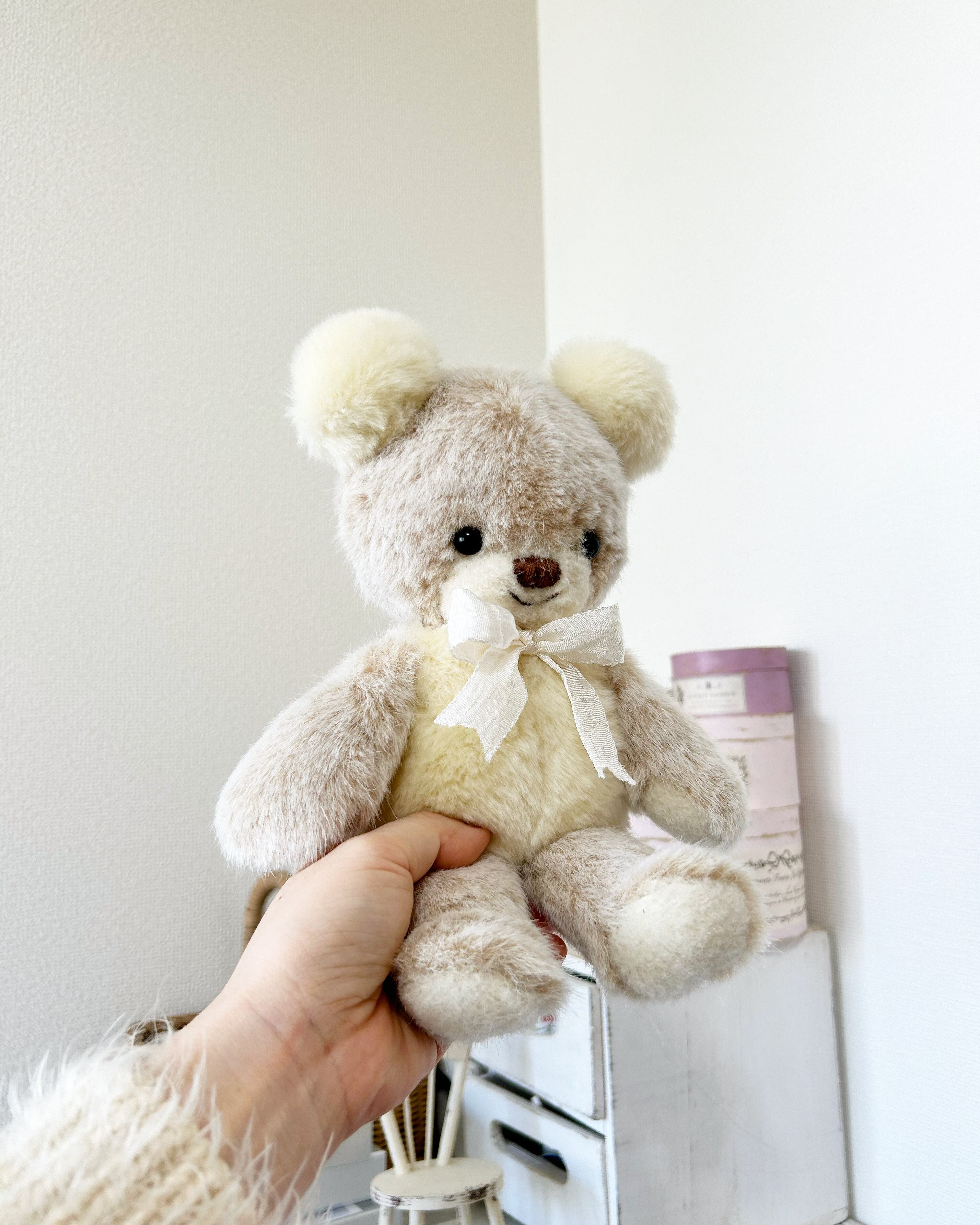 ちょこんとお座りをしているふわふわのくまちゃん。